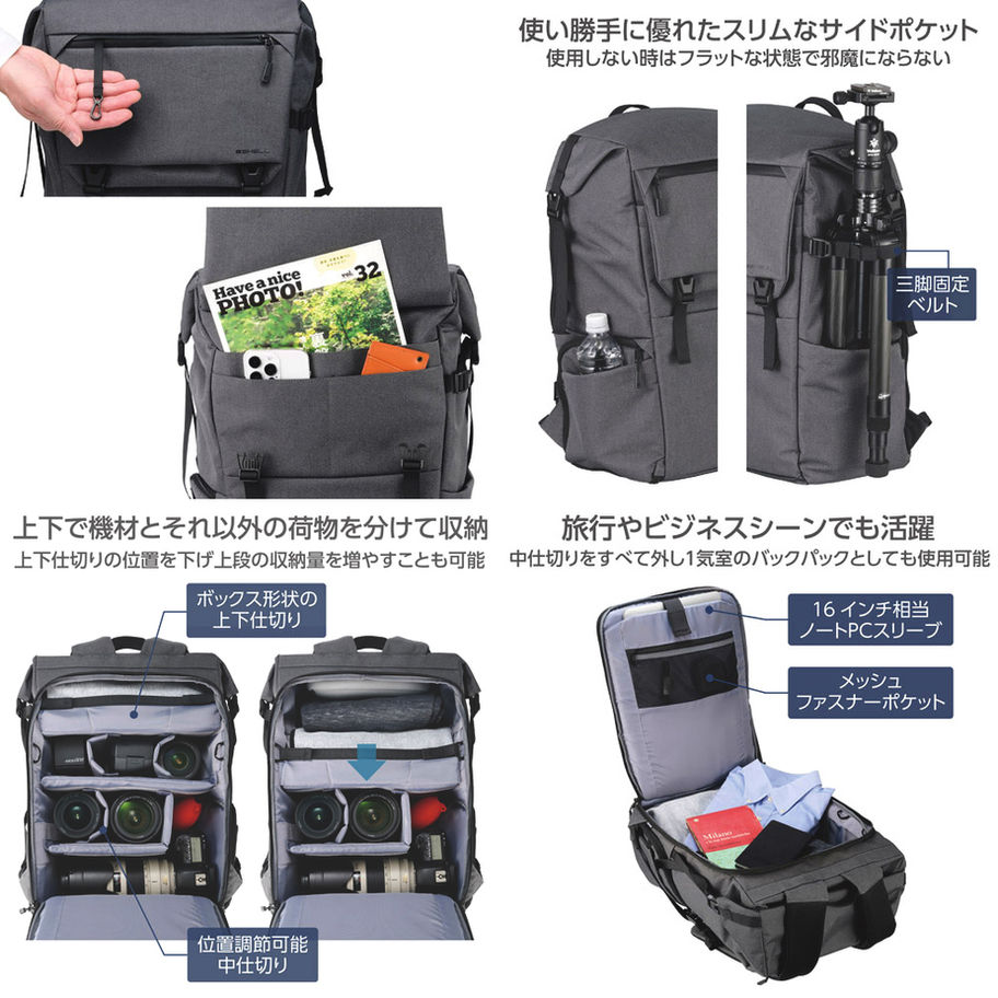 - Roll Top Backpack 26 G05 具有完全開放的後部取用結構,可以一目了然地查看和整理您的設備,並且還具有側面取用功能,讓您無需放下包就可以取出相機。這是一款大容量卷蓋背包,結合了雙腔包的便利性和箱形上下隔層。